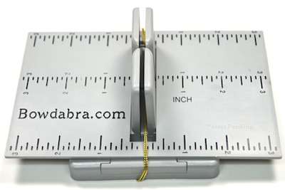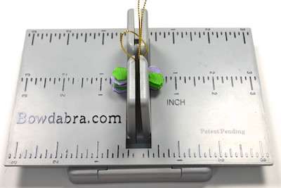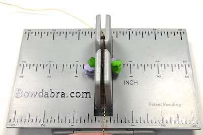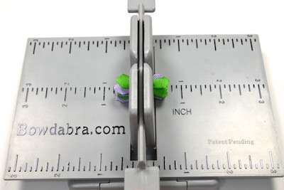 7. Place the Hair Bow Tool & Ruler onto the Mini Bowdabra. Cut 18″ of Bowdabra Bow Wire and fold it in half and place it into the Mini Bowdabra.