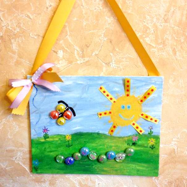 - Day two involves gathering up supplies for them to glue on to their painting. This can be anything you have around the house. We used stones, ribbons, small plastic bugs, rocks, sticks,etc.