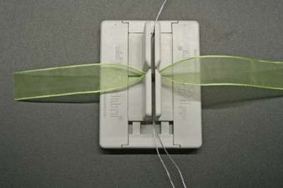 9. Cut a piece of ribbon and fold it in half to create a crease. At the crease mark press the ribbon into the Mini Bowdabra.