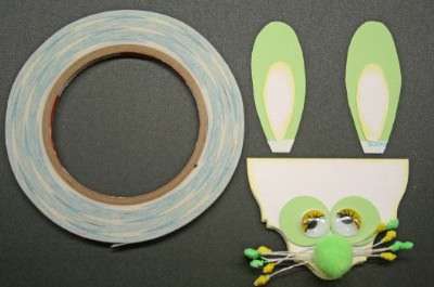 7. Cut out bunny ears and glue together. Glue a pom pom for the bunny’s nose. Place double sided tape at the bottom of the ears.