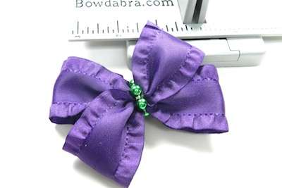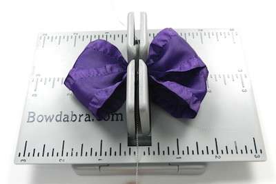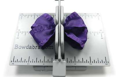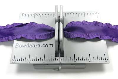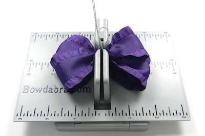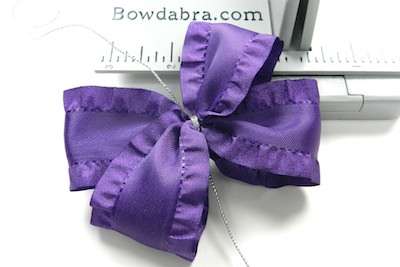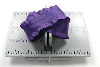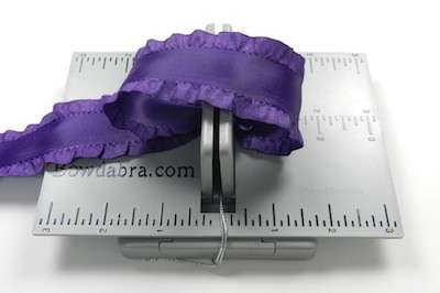 6. Cut 18″ of ruffled ribbon and fold it in half to form a crease – at the crease mark press the ribbon into the Mini Bowdabra.