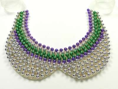 Using Mardi Gras beads that I found at the Dollar Store, I designed a beaded collar necklace. I finished the beaded bib style