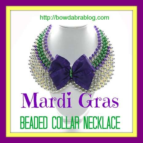 15. Trim away excess wire. Glue a few Mardi Gras beads around the center of the bow to hide the wire.