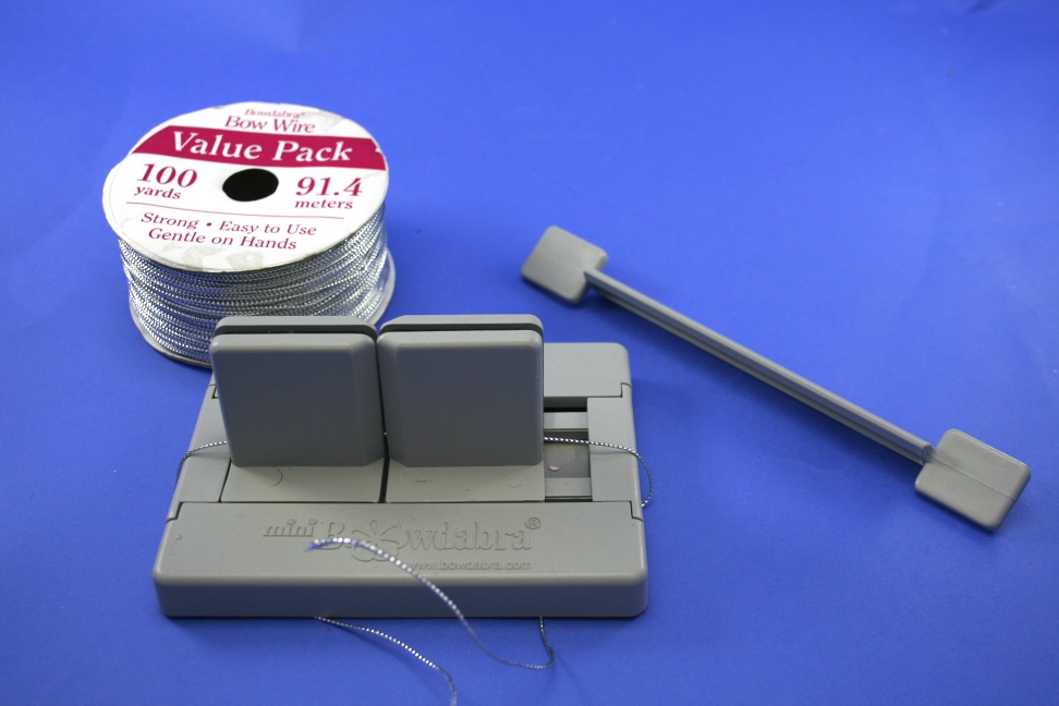 2. Next, cut Bowdabra Bow Wire 18″ long. Fold the wire in half and place into the Mini Bowdabra. Optional: Leave the wire long instead of folding in half. Tuck the ends of the wire under the Mini Bowdabra to keep them out of the way.