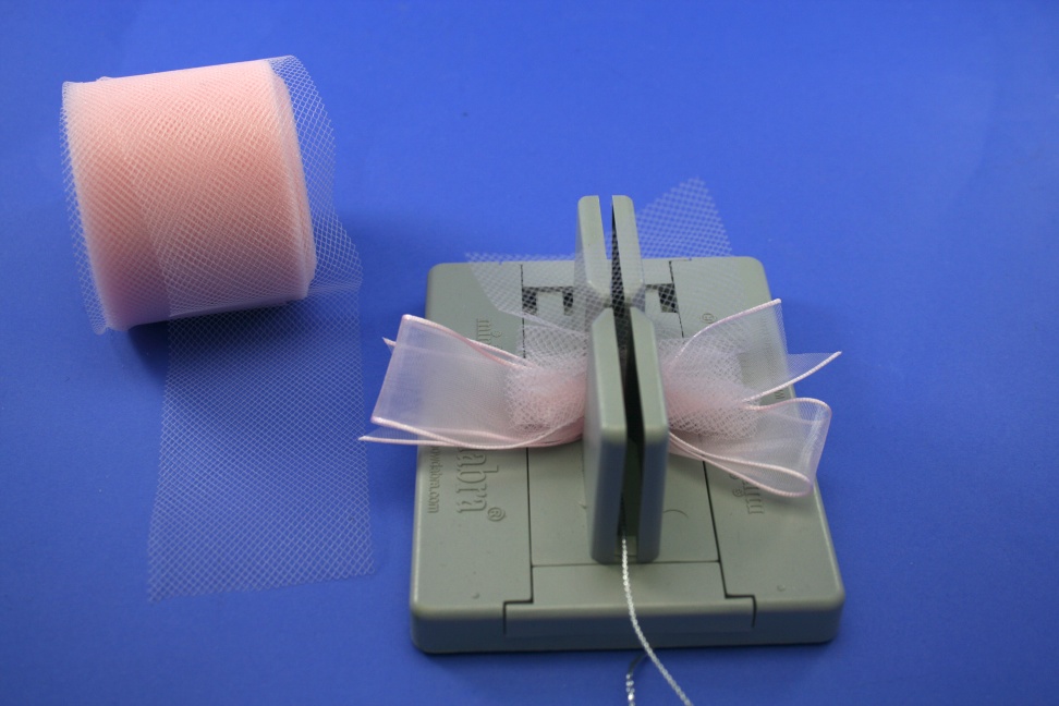 4. Using 3″ wide sheer tulle scrunch it down like an accordion into the center of the Mini Bowdabra. Trim from spool once you feel like you have enough tulle in the center.