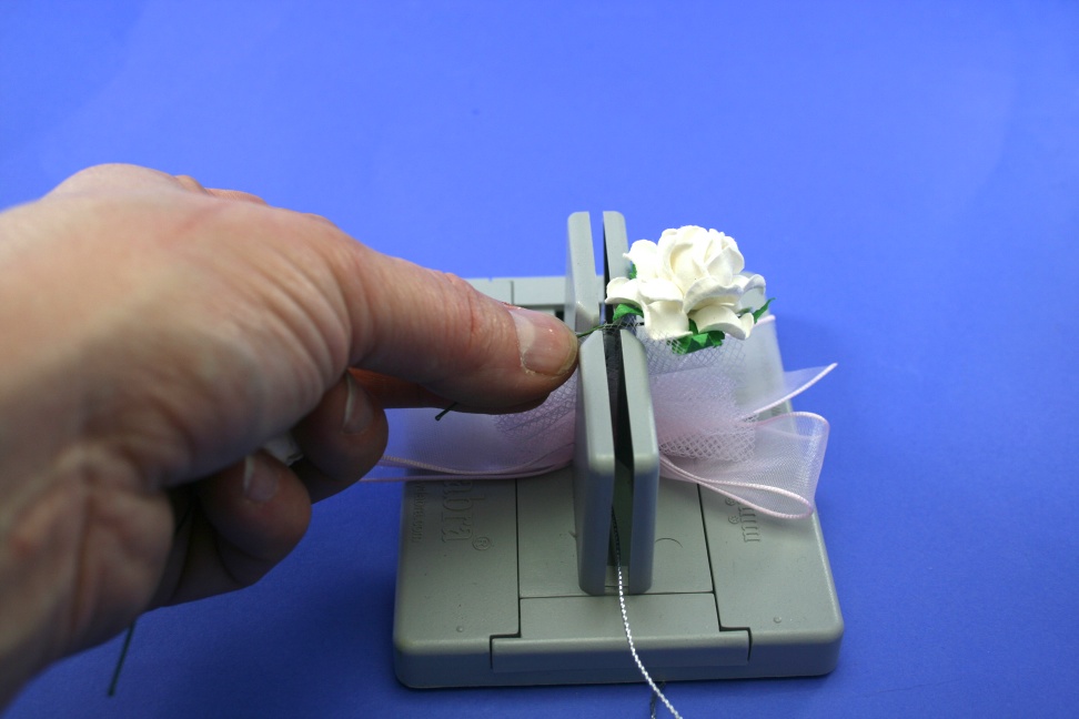 5. Place a small flower in the center of the Mini Bowdabra. Place the wire on one side the flower close to the center of the Mini Bowdabra.