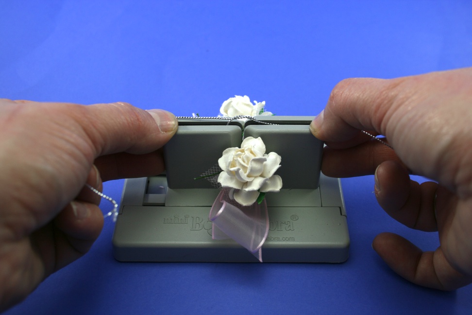 7. Scrunch down with the Mini Bowdabra. While the bow is still in the Mini Bowdabra, thread the two loose ends of the Mini Bowdabra Bow Wire through the loop at the other end. Optional: If you have one long strand of Bowdabra Bow Wire tie the wire together. Pull the Bowdabra Bow Wire tightly while the bow is still in the Mini Bowdabra.