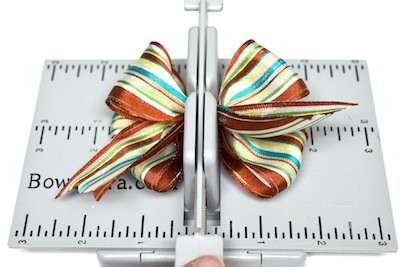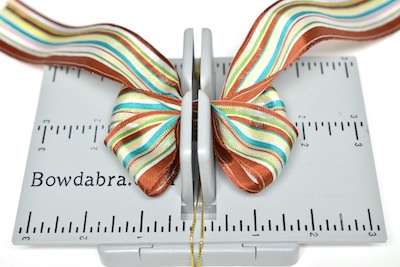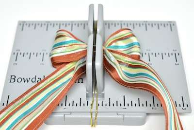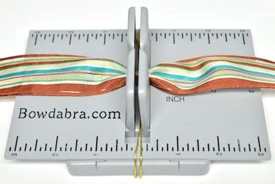 8. Cut 30″ of ribbon and fold it in half to create a crease. At the crease mark press the ribbon into the Mini Bowdabra.