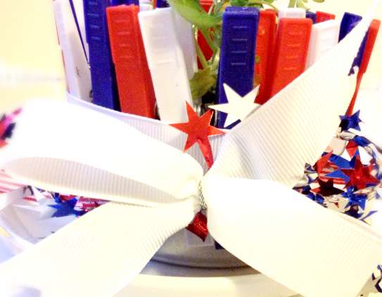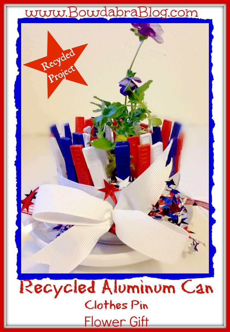 This week on the Bowdabra Blog our designers are sharing eco-friendly (reuse, recycle, re-purpose) home decor projects. If your home is anything like mine, you will find it full of cans and glass jars. We’ve created fun projects with these items over the years. One of my favorite is to use the cans and little planters to give as gifts or to make centerpieces for parties. Here is a cat food container which we used to make little center pieces for a patriotic party.