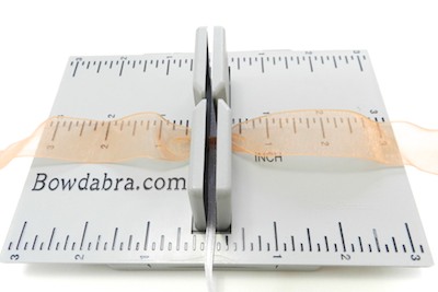 1. Place the Hair Bow Tool & Ruler onto the Mini Bowdabra. Cut 10″ of 1/8″ of ribbon and place it into the Mini Bowdabra.