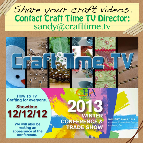 Craft Time TV’s soft launch is scheduled for December 12, 2012, and will be making appearances at the CHA Winter ’13. To learn how to submit your videos or for more information contact Craft Time TV Director, Sandy Sandler. Please follow the link to our contact form and place Craft Time TV in the subject line.