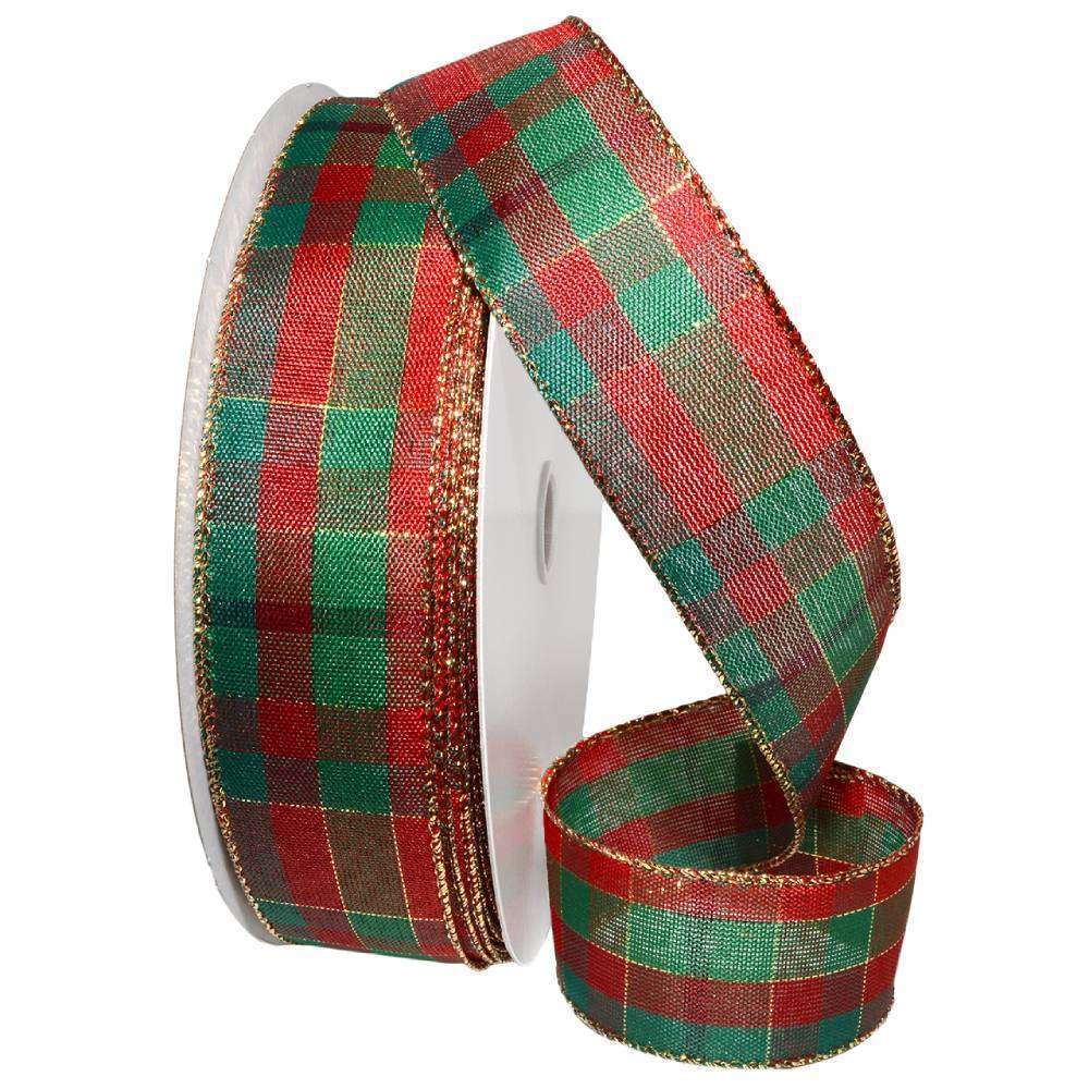 Towson ribbon is a classic Holiday plaid. Popular year after year so always on-trend. The rich plaid is red and green which mix to create shades of burgundy and hunter green. Excellent for Christmas trees, sways, wreaths, center pieces, gift wrapping and more. This wired ribbon is made of 100% Polyester and is edged with gold metallic thread. Towson is woven, making it the same bold plaid pattern on both sides.