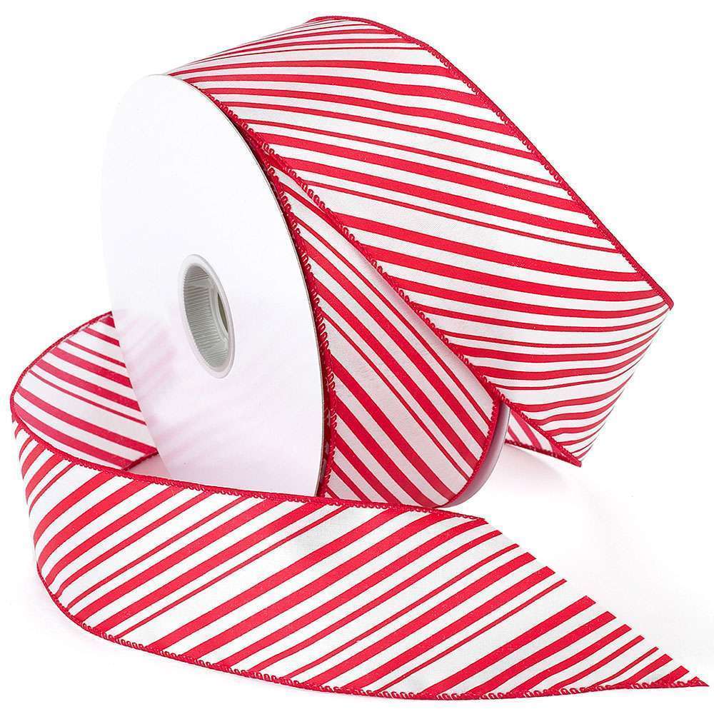 Peppermint ribbon is a whimsical red and white Holiday ribbon in a bold diagonal stripe. Peppermint and candy themed patterns are always on-trend year after year. This ribbon is excellent for decorating Christmas trees, sways, wreaths, center pieces, gift wrapping and more. This wired ribbon is made of 100% Polyester.