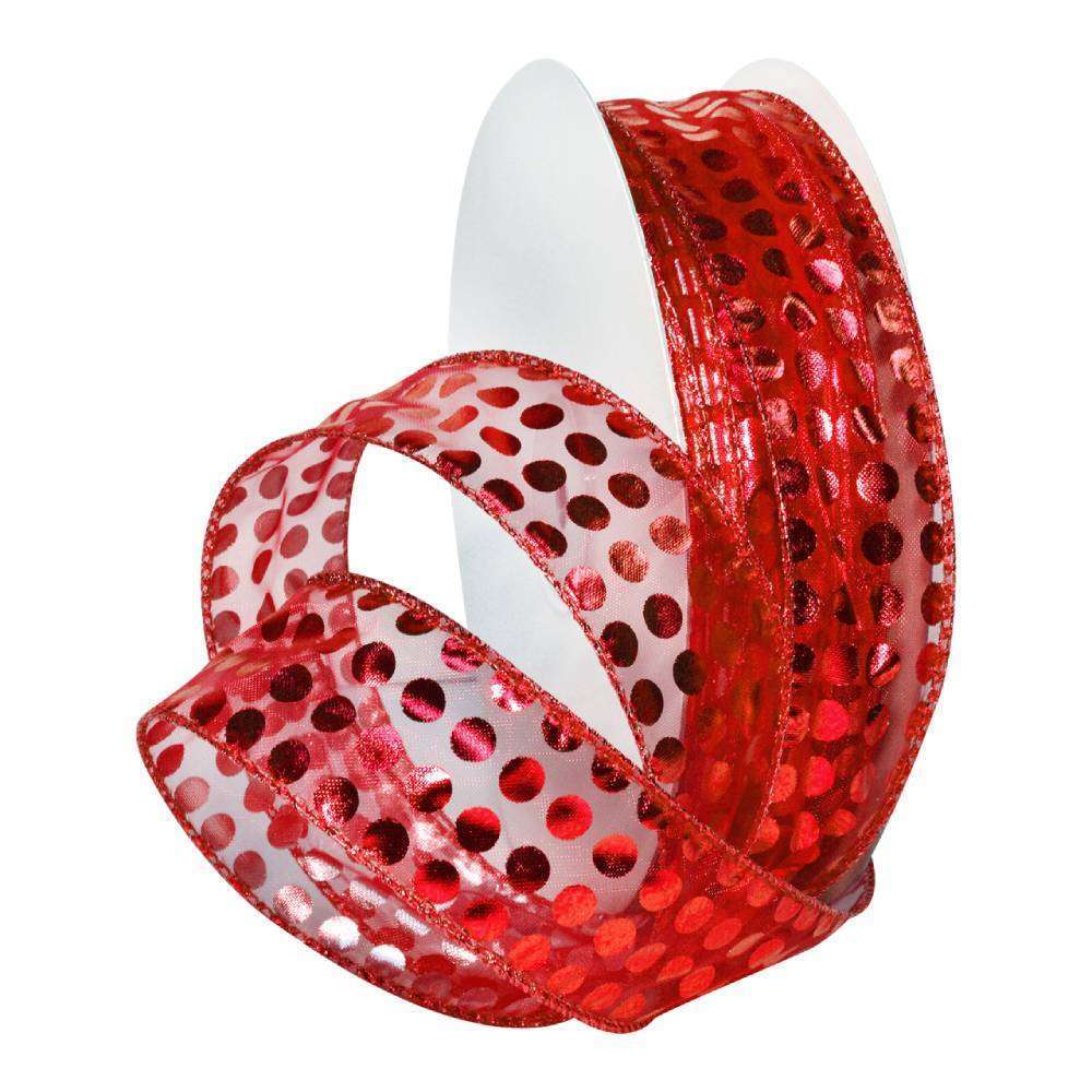 Metallic foil sheer dots closely arranged on a sheer background of various colors. Great attention-getting holiday or party decorating item. Comes with a wire-edge to help forms bows and shapes that will hold in almost any design.