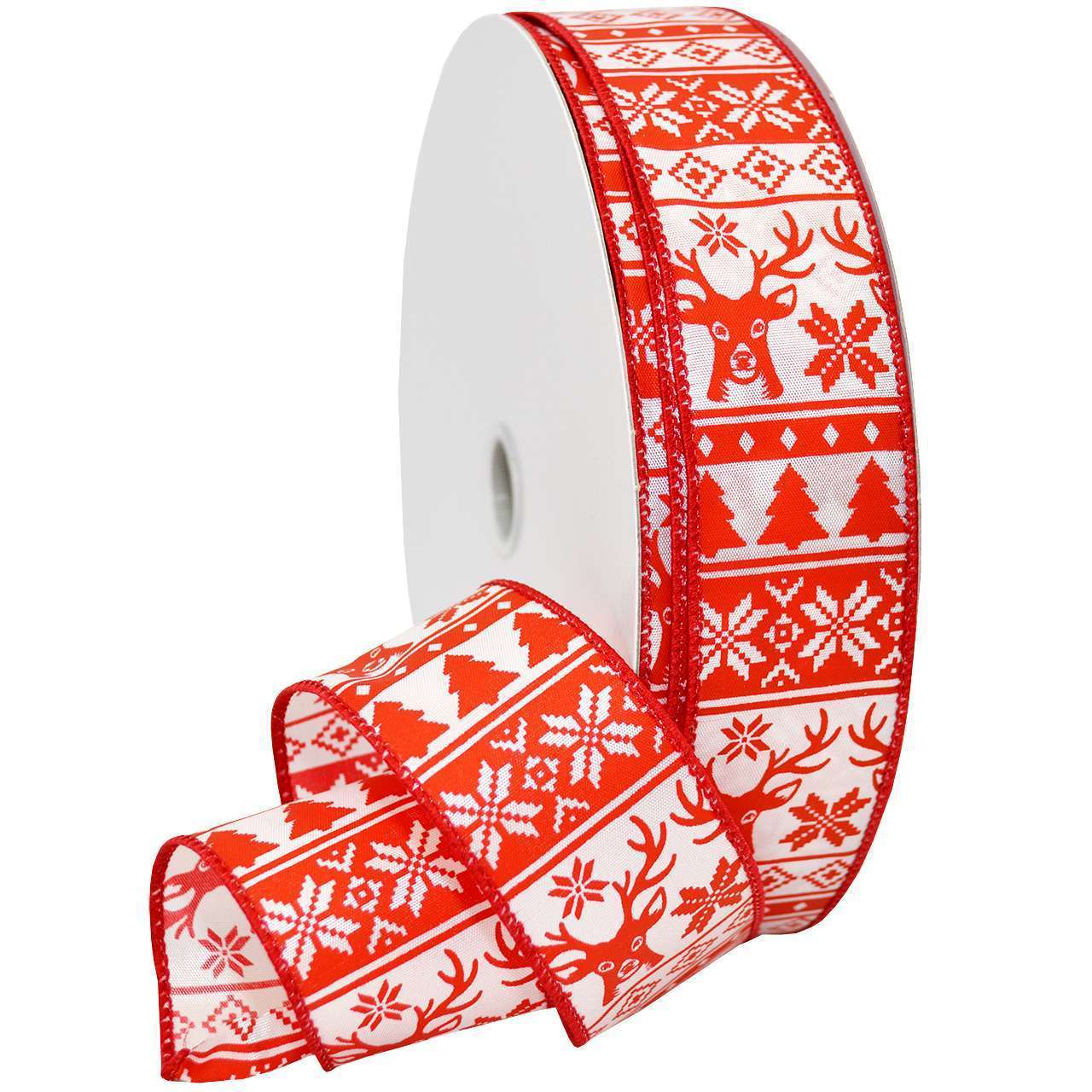 Christmas Sweater ribbon is a red and white bold design. Holiday sweaters never seem to go out of style so you are always on-trend year after year. This ribbon is excellent for decorating Christmas trees, sways, wreaths, center pieces, gift wrapping and more. This wired ribbon is made of 100% Polyester. So versatile and the economical put-up makes this the perfect ribbon for large projects and events!