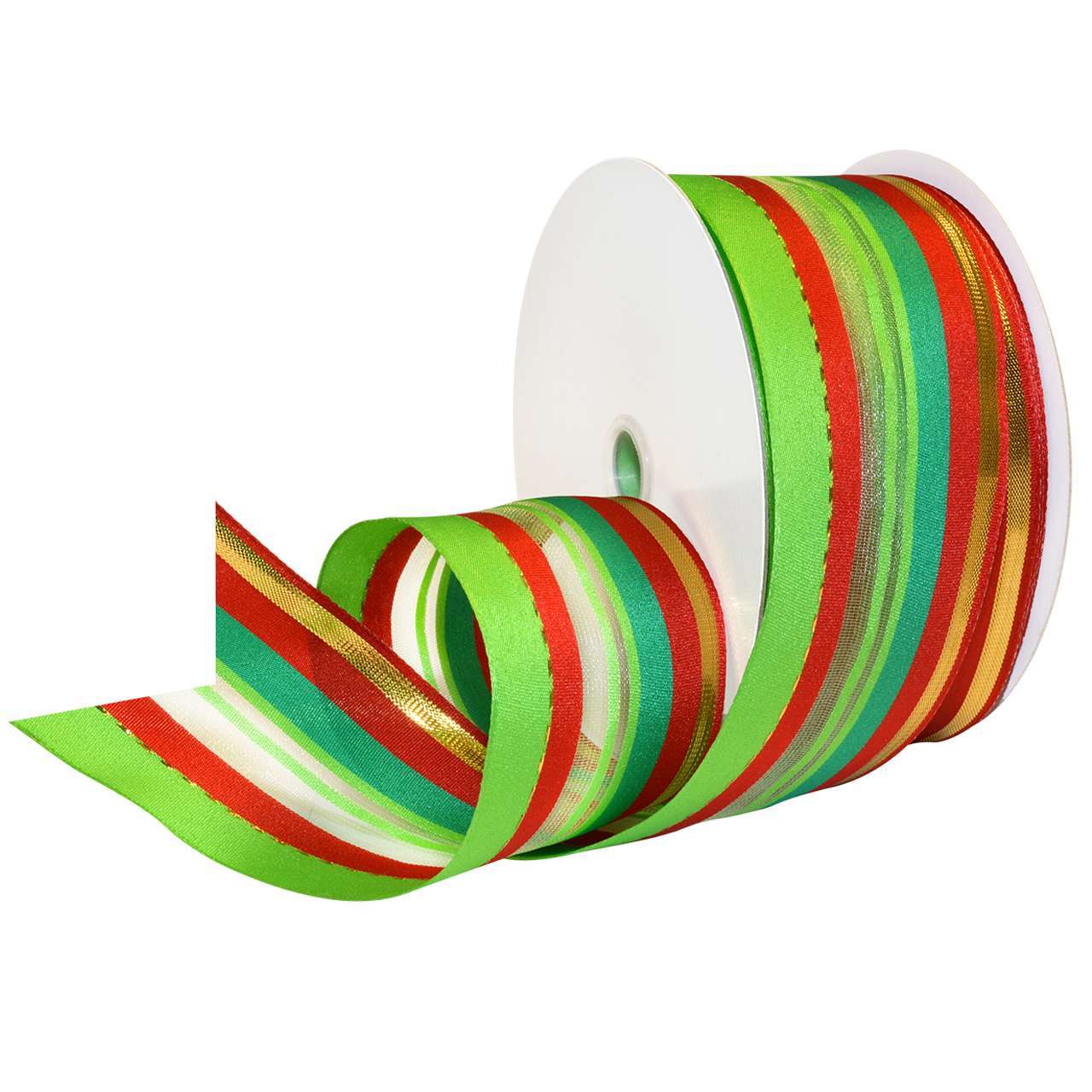 Deco Holiday ribbon is a stylish mix of red, green, solid and sheer material , accented with Gold stripes. This wired ribbon is excellent for decorating Christmas trees, swags, wreaths, center pieces, gift wrapping and more. This wired ribbon is made of 96% Polyester, 4% Metallic. So versatile and the economical put-up makes this the perfect ribbon for large projects and events!