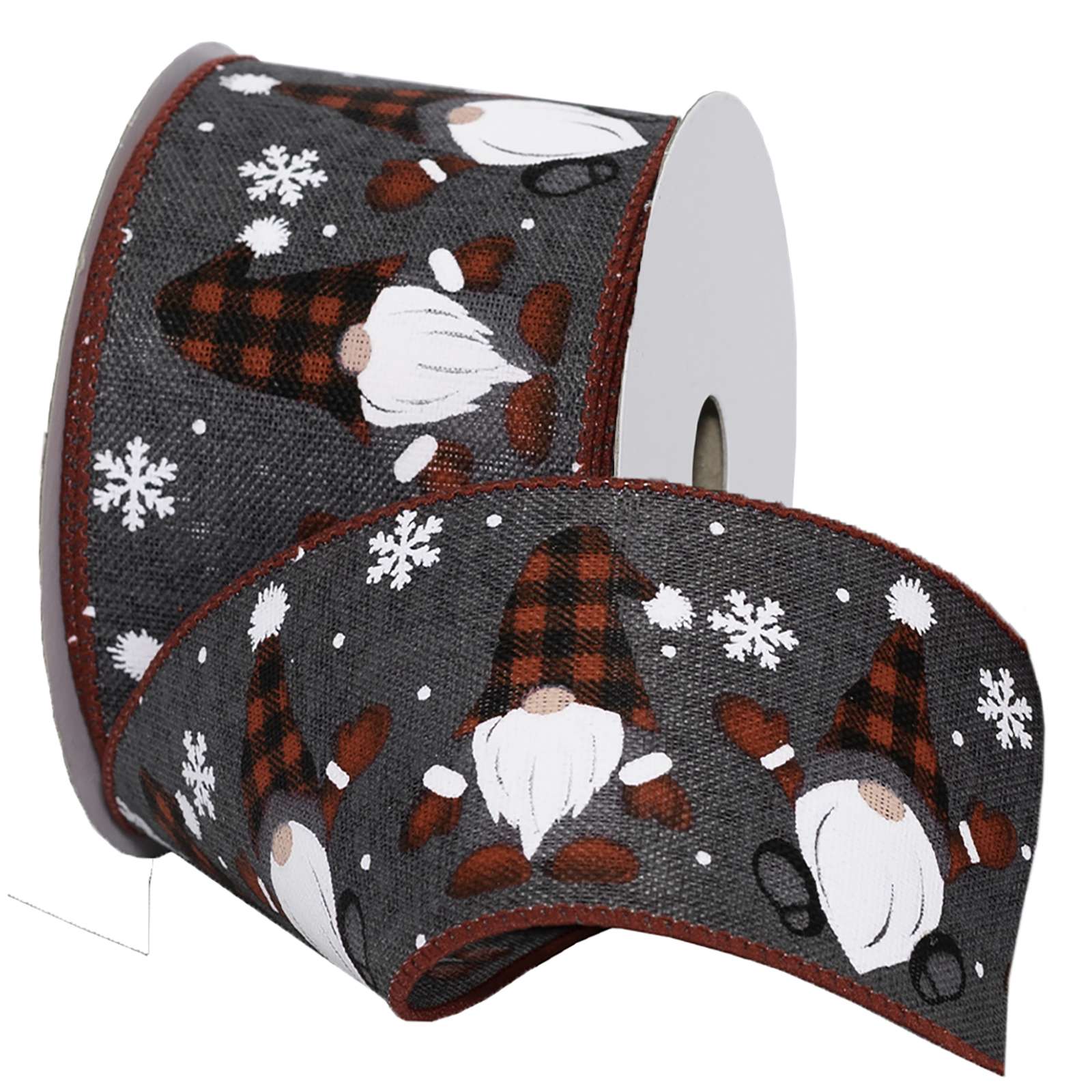 Happy little gnomes are waving across this on-trend color gray ribbon. Wired and edged in a rich Holiday Red, the gnomes are fitted with buffalo plaid hats in red & black. Snowflakes are falling in the backhround and in between. Create charming decorated wreaths, trees, swags, packages and more! Made of 100% Polyester.