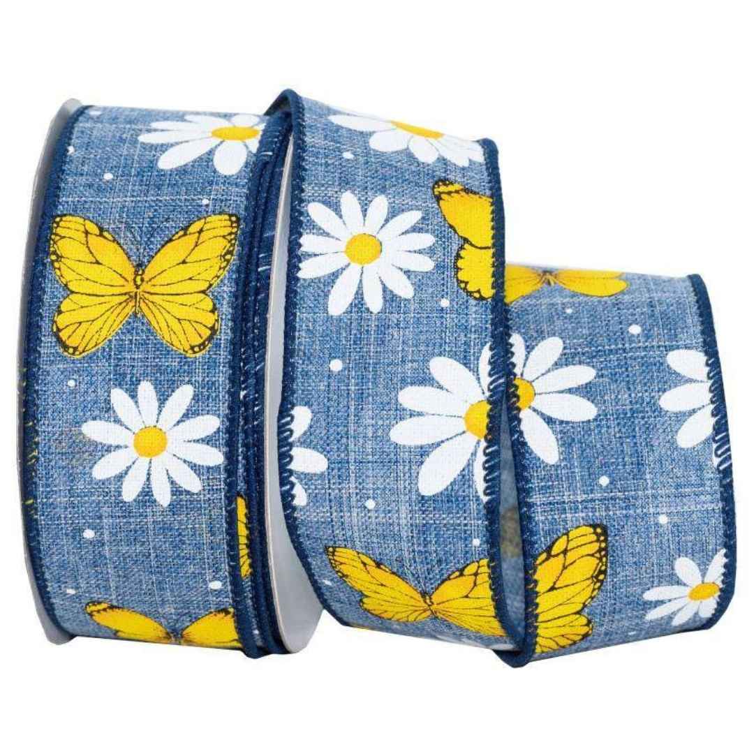 White spring daises and butterflies on a solid color coordinated background. Great ribbon for making large bows and adding to wreaths and swags. This product is wired and made from 100% Polyester fabric. Morex Ribbon is an importer and manufacturer of decorative ribbon, offering a large variety of creative, fashion-forward quality ribbon.