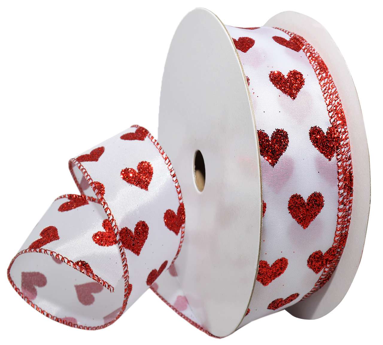 This classic Valentine ribbon is adorned with glittered hearts on a field or white Satin. A wired sewn metallic edge accents the design. Add a romantic and shimmering bow to your creations. Design beautifully decorated floral arrangements, packages and more! So versatile and the economical length makes this the perfect ribbon for large projects and events! Made of 100% Polyester.