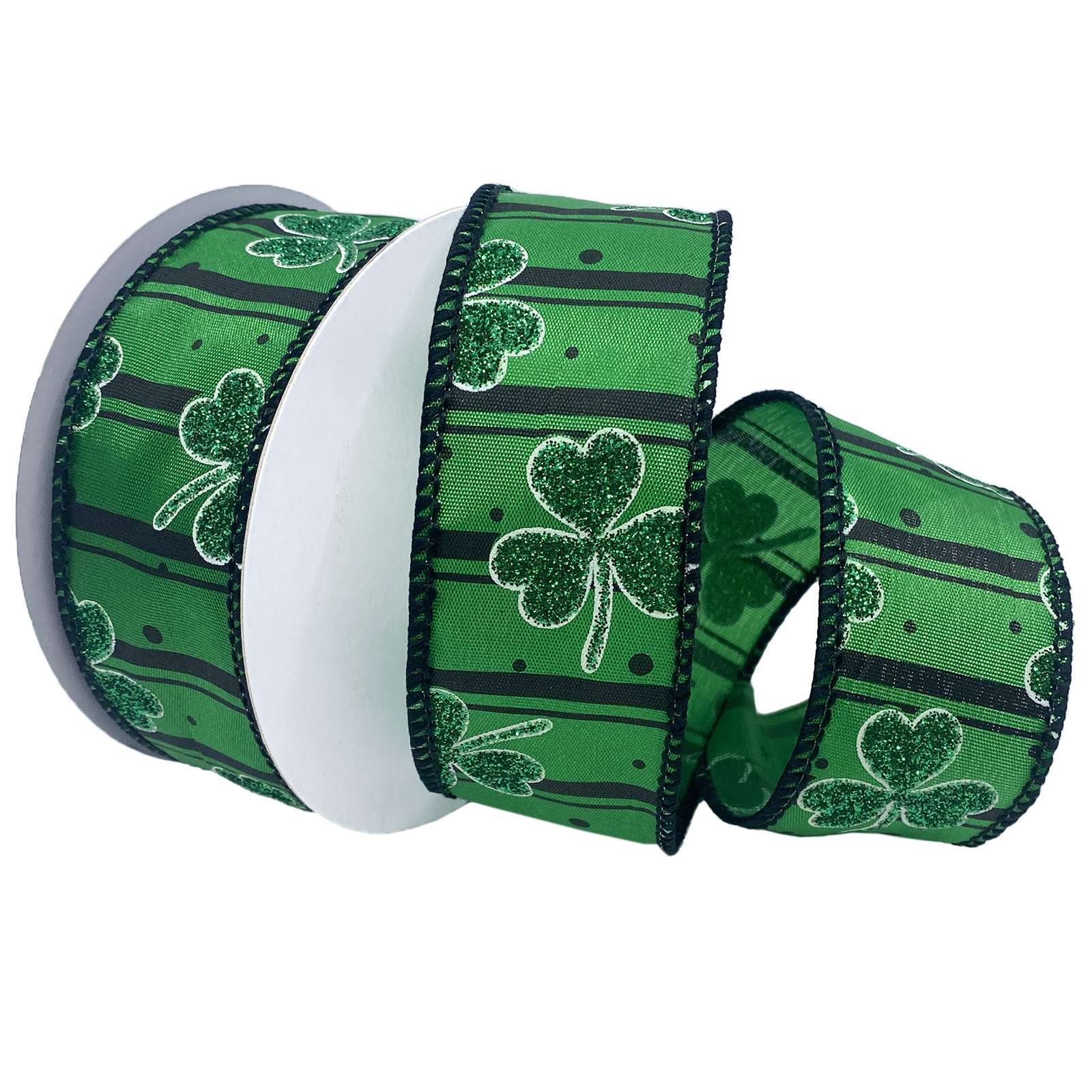 Offered in two different backgrounds, glittered shamrocks float across a white background with black horizonal lines for modern look. Lime color or black dots add to the whimsey and fun of this design. Add this sparkling St. Patrick’s Day ribbon to your floral arrangements, wreaths, packages and more! Made of 100% Polyester.