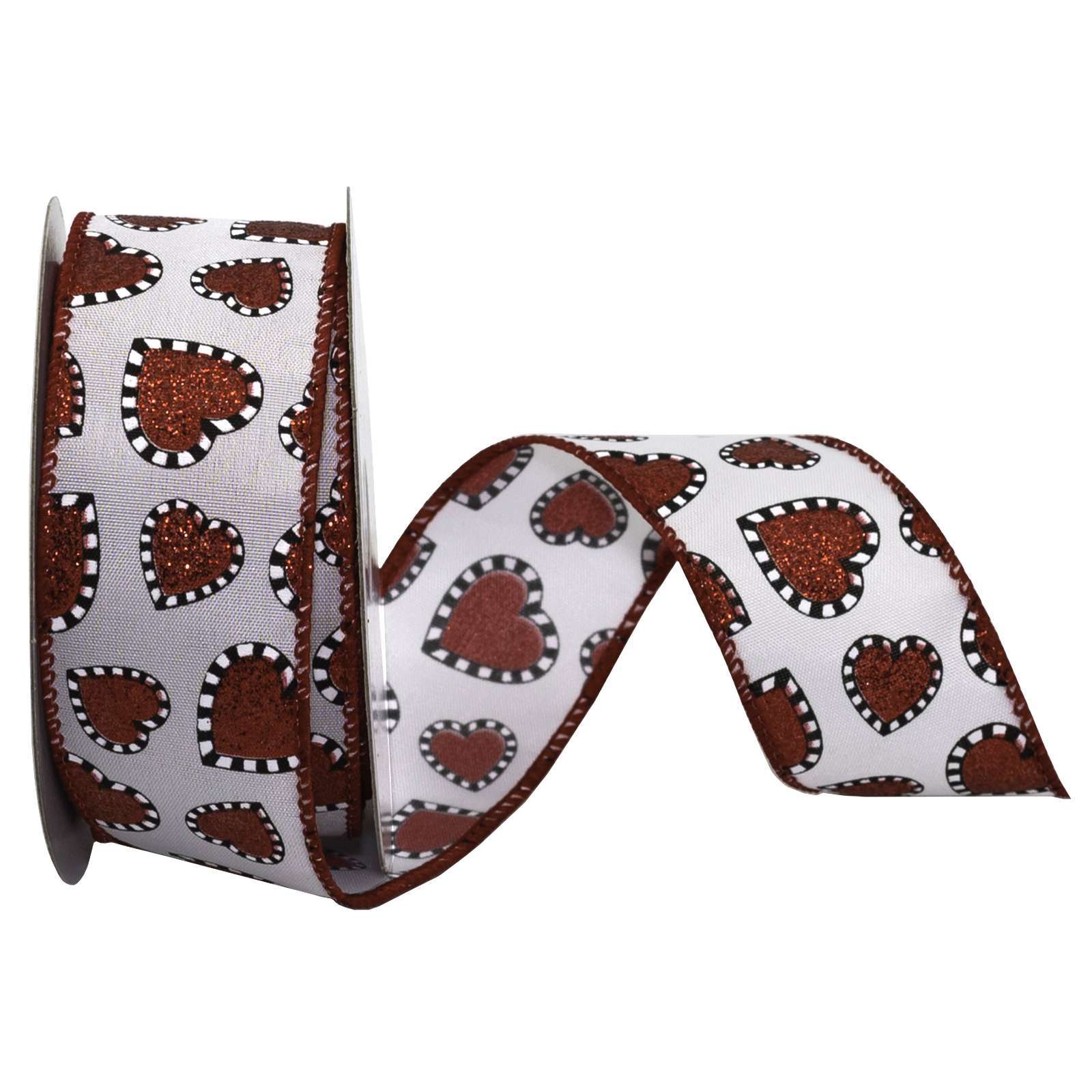 Floating glittered red hearts are outlined with a black and white checkerboard design. It is wired with a sewn metallic edge and on a field of white satin. Add this bold and whimsical Valentine ribbon to your foral arrangements, packages and more! Made of 100% Polyester.