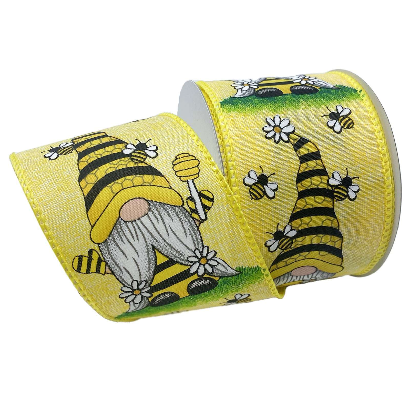 Two popular icons, Bees and Gnomes, combine to create a whimsical and fun ribbon. In bold yellow, white, and black these cute bee keeper gnomes are sitting on a patch of green grass. This pattern mixes well with other bee designs, Cambridge gingham, polka dots and others. Brighten up your creations for Spring, Summer or just to enjoy everyday. Create striking wreaths, swags, home decorations, gift wraps and more! This product is made from 100% Polyester fabric and is wired.