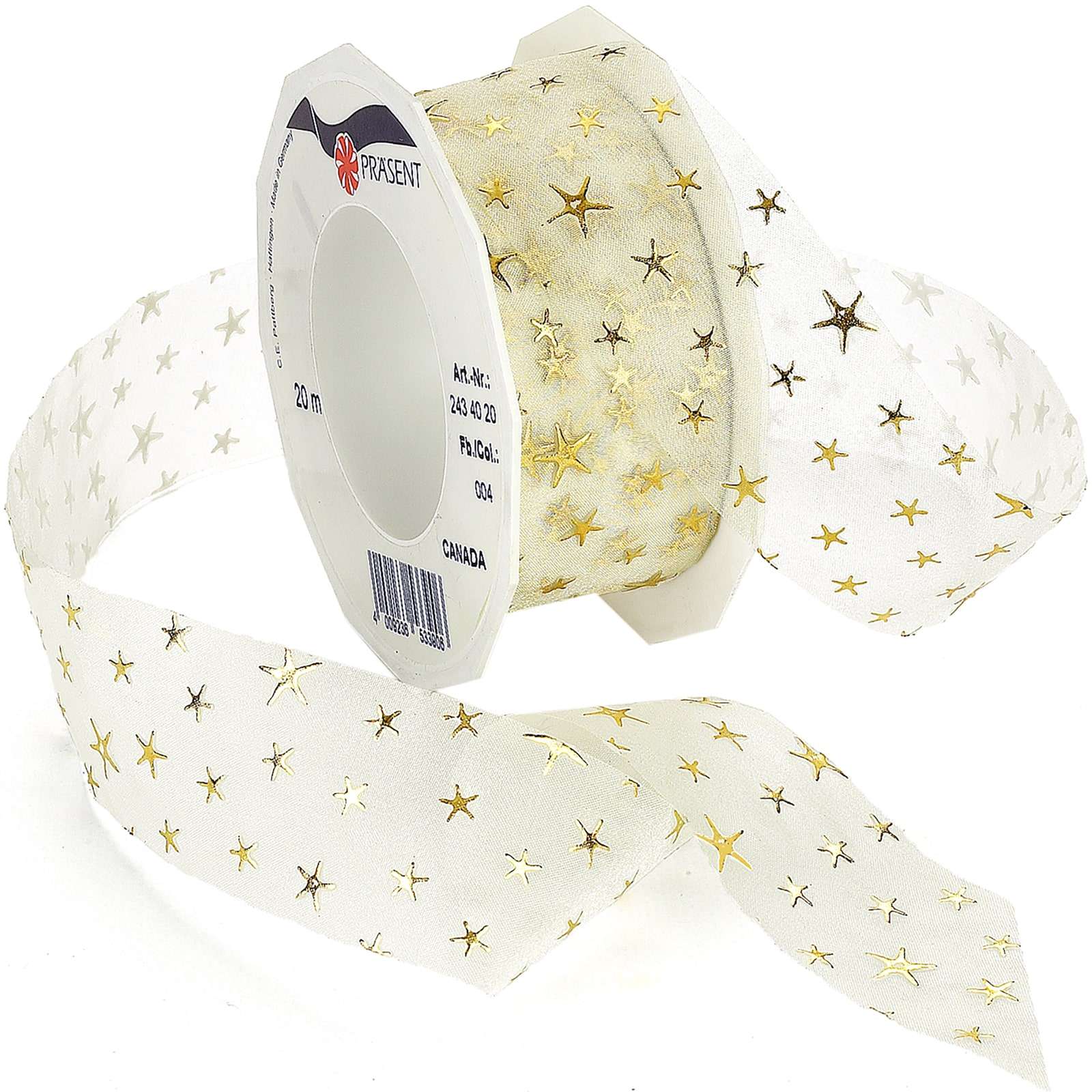 Canada ribbon will add a sparkling touch to all your decorating projects. This sheer ribbon is made from 100% Polyester and is woven, with metallic raised gold stars. It is a great Holiday pattern and will work on many designs, decorative and floral.