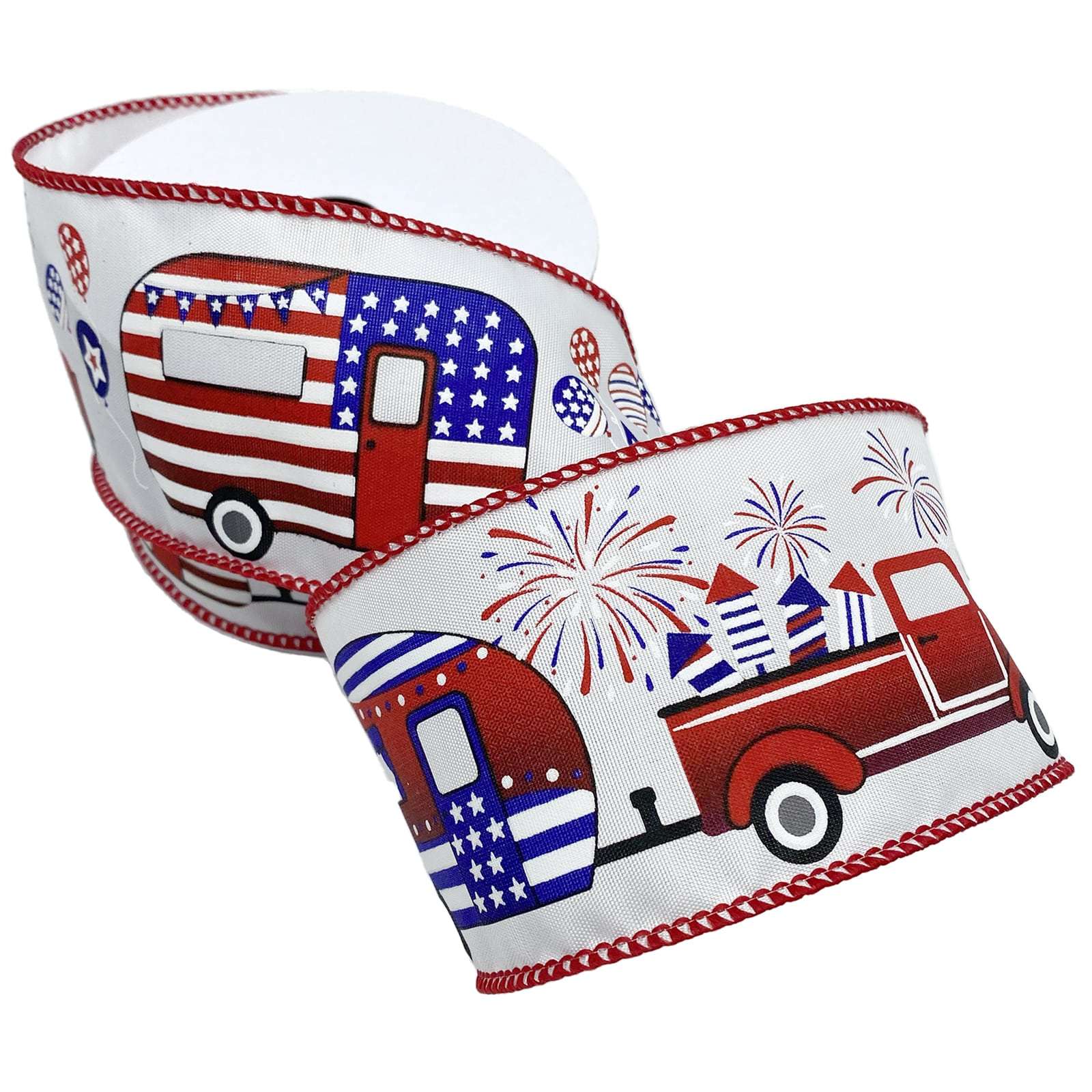Fire works, trucks filled with stars, and red, white & blue balloons, this holiday ribbon has it all. Great for all your patriotic decorating. The white linen lke background is edged in red. A wired edge helps to form shapes in arrangements, decorations or in gift wrap applications. This product is made from 100% Polyester fabric. Morex Ribbon is an importer and manufacturer of decorative ribbon, offering a large variety of creative, fashion-forward quality ribbon.