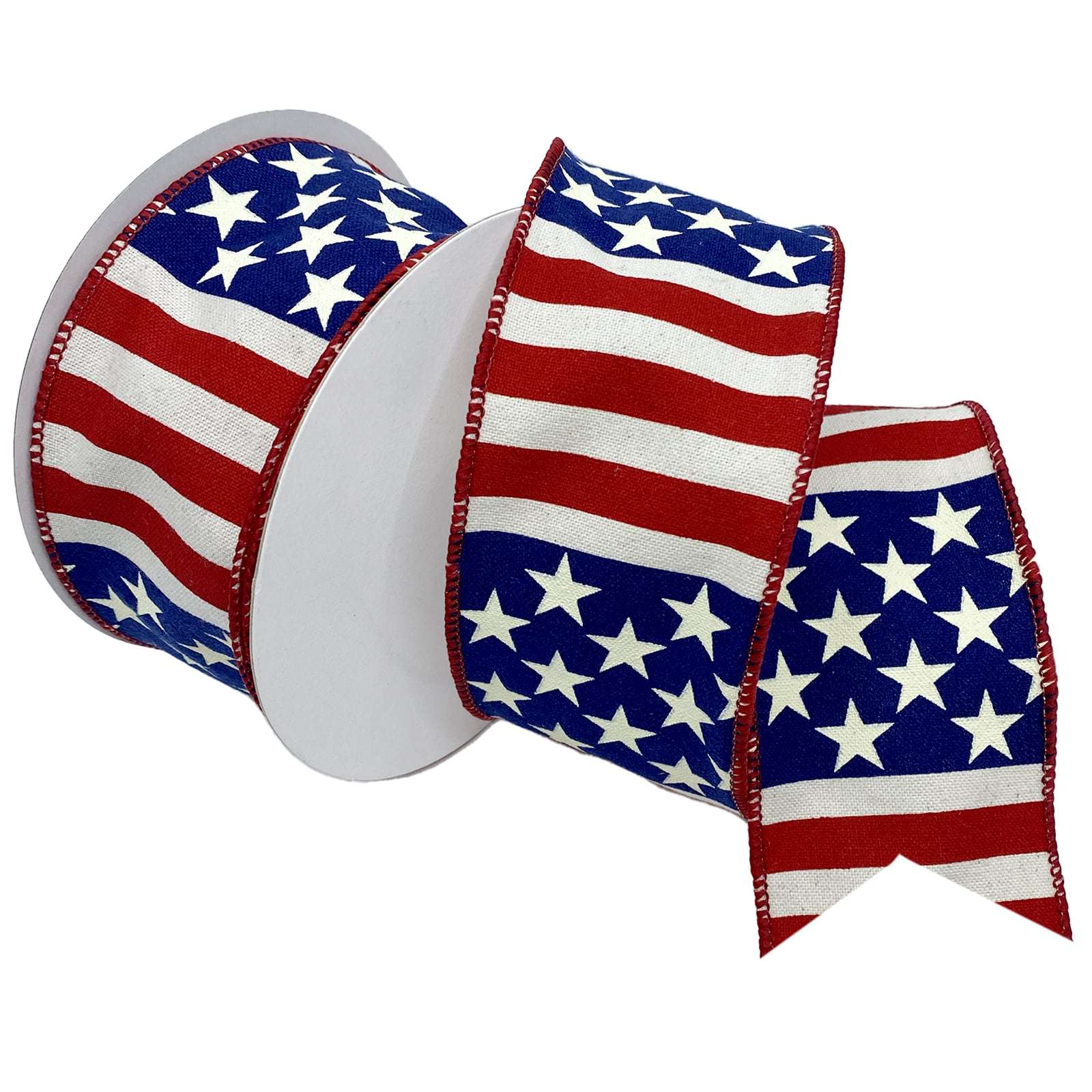 Bold red and white stripes and stars on a true navy blue refect old Glory in ribbon from. A wired edge helps to form shapes in arrangements, party decorations or in gift wrap applications. This product is made from 100% Polyester fabric. Morex Ribbon is an importer and manufacturer of decorative ribbon, offering a large variety of creative, fashion-forward quality ribbon.