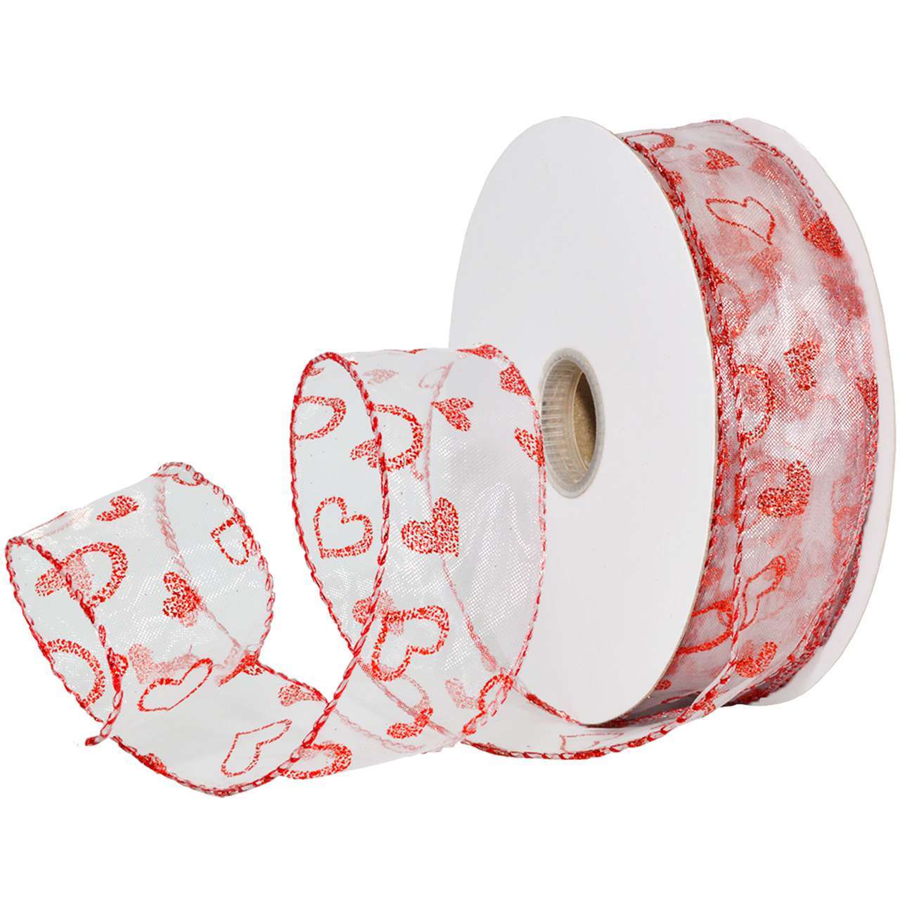 Free form glittered hearts, gives this wired sheer Valentine ribbon a whimsical charm. Create beautifully decorated floral designs, packages and more! So versatile and the economical put-up makes this the perfect ribbon for large projects and events! Made of 98% Polyester, 2% Wire