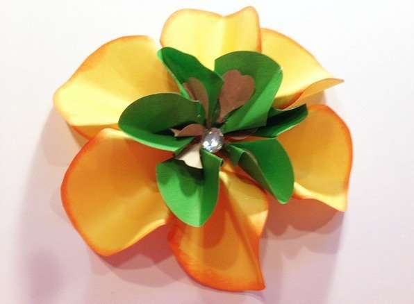10. Use hot glue to assemble the flower. One of the smaller yellow circles will be your flower’s base. Finish with a gem in the center. (Optional attach curling ribbon along the bottom for extra dimension.)