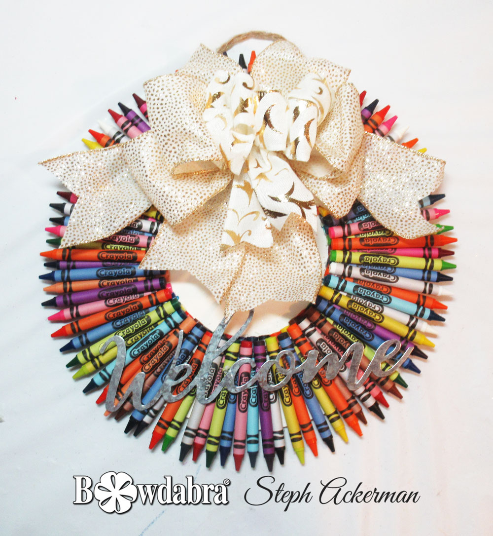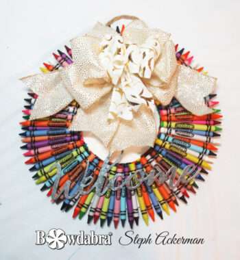 Hi everyone, Steph Ackerman here with the perfect gift for the special teacher in your child’s life.  Using a wood pallet and 4 boxes of Crayola crayons, create a crayon wreath and finish with a lovely Bowdabra bow.