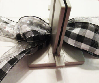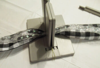 Holding both ribbons together, place a 12″ length in the Bowdabra.