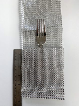 Begin by laying out the mesh ribbon and place a silverware piece (fork) on top. For a visual presentation of the silverware, fold the mesh over the fork to measure where to cut to create a holder. In this case – at the 5.5″ mark.
