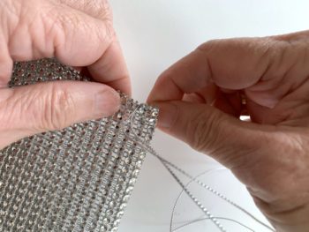 Remove the fork making sure the mesh ribbon is folded neatly and straight, matching rows. Then cut mesh, creating a folded 5.5″ piece.