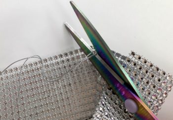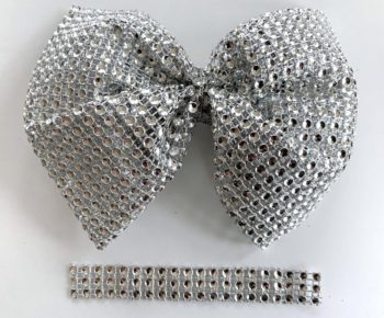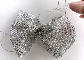 Then cut out 3 rows of rhinestones mesh, five inches long to wrap around the middle of the bow, sealing with glue for a finishing knot.