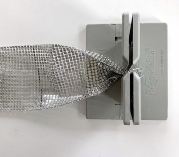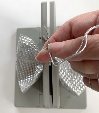 Then cut a 20″ piece of Bowdabra bow wire, folding in half. Dip the two ends into a quick-drying glue and twist each end to a point and let dry. Then, making sure the folded mesh holder rows are evenly aligned – straight, matching, and together, insert the bow wire ends into the first holes at the bottom fold (in one side and out the other) – pulling the bow wire out midway.