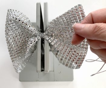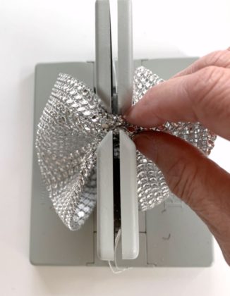 To dress up the silverware holder, let’s make a pretty mesh bow. Begin by cutting an 18″ piece of Bowdabra Bow Wire and folding it in half. There will be a loop at one end and two loose ends at the other end. Lay it into the Bowdabra, tucking ends, and loop under. Cut a 16″ piece of rhinestone mesh ribbon, right side facing down and creasing one end down into the Bowdabra.