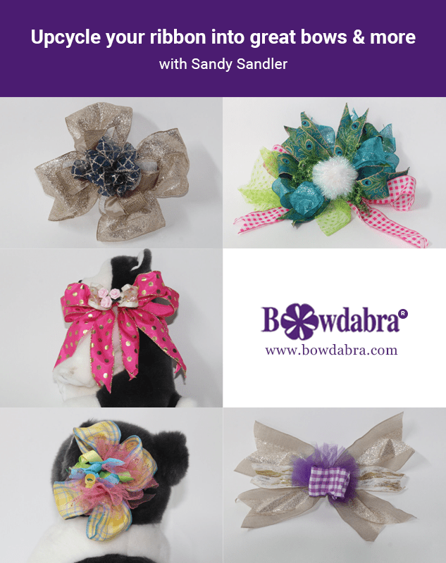 Sandy Sandler, creator of Bowdabra bow making tool makes some really pretty and super easy hairbows, ponytail holder bows, headband bows and more with upcycling the ribbon scraps.
