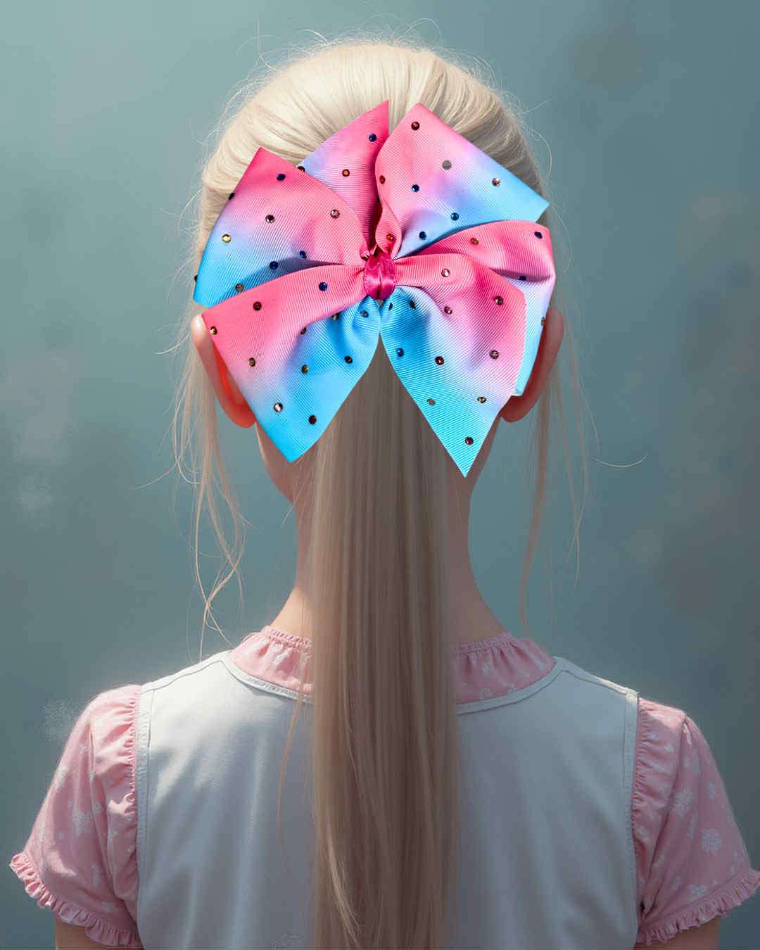 Use a small piece of matching ribbon to wrap around the center of the bow, and use the excess ribbon to tie the no-sew pinwheel hair bow to the ponytail holder.