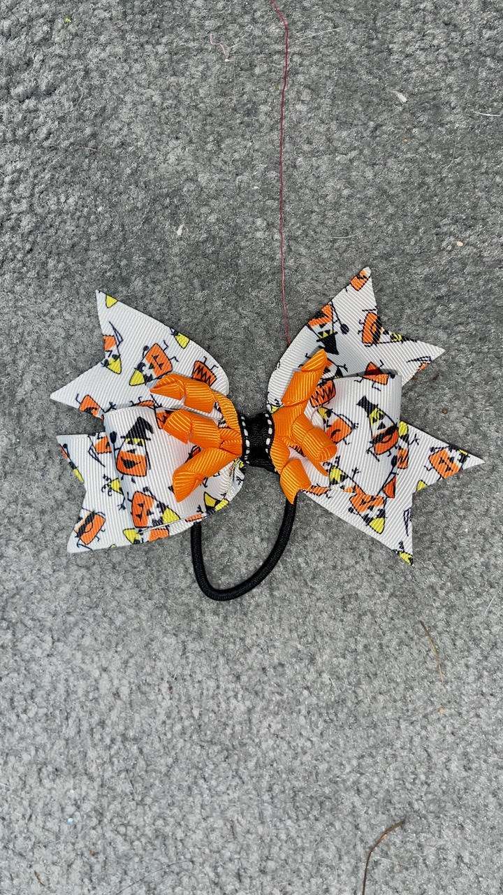 For a perfect touch, take a thin piece of grosgrain ribbon and, using a Zot or some hot glue, bring the ribbon all around for a finished look. Use the excess wire to tie the little Halloween hair bow onto the ponytail holder.
