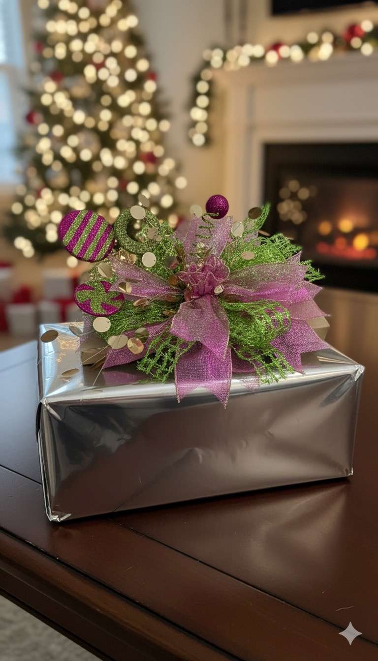 Use a glue dot, hot glue, or the excess bow wire to attach the holiday gift bow to your package.