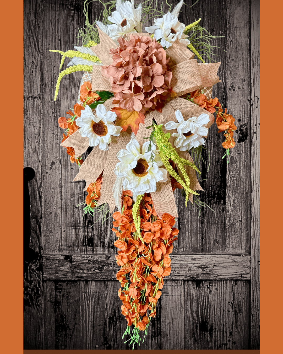 To finish, pull the long side down and adjust the floral and ribbon. You have a beautiful transitional season swag to use on your door or even add to an extra-large wreath!  Easy and no hot glue needed!!
