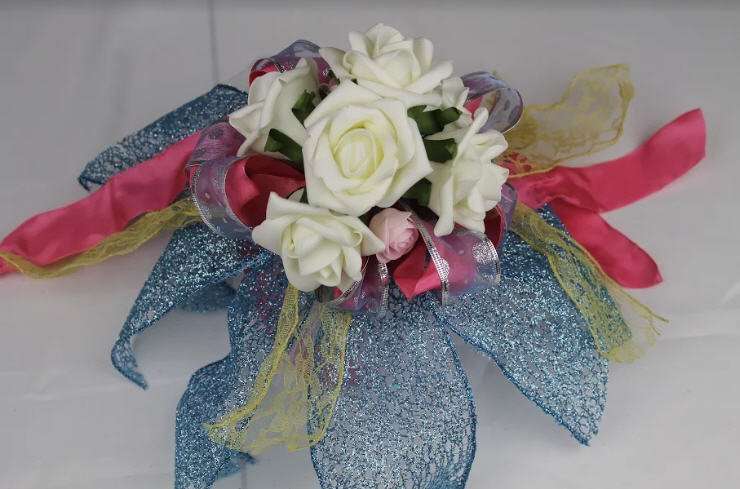 Sandy uses a 32” ribbon along with a few more differently patterned ribbons (34” long and 1.5” wide). Sandy uses another blue ribbon (34” long and 1.5” wide) and tops it with more ribbons of different texts, patterns, and colors. She adds a 34” Bowdabra champagne ribbon and scrunches it over the rest making loops. Next she inserts another champagne ribbon over it and scrunches it all with several other big sized ribbons. She ties it all to finish the gorgeous looking chair and pew bow that can also be used for wedding décor or spring bow.
