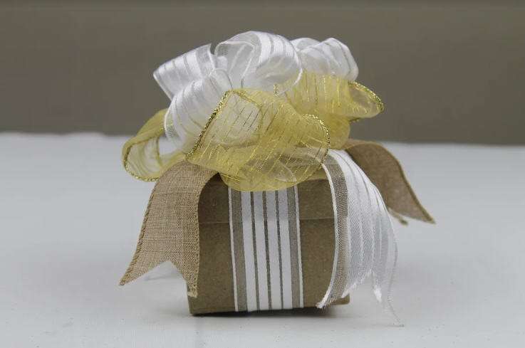 Sandy begins the project with a dovetailed burlap ribbon (10” long and 1.5” wide). She uses a golden ribbon, 31” long, and scrunches it in the Big Bowdabra making loops in an X manner. She uses a white stripped ribbon and scrunches it making loops. She ties it all and shapes the ribbons to finish the beautiful bow that can be used as a wedding bow for bride’s mother, or party bow for the guests. She ties the bow to a gift package to give it a more authentic look.