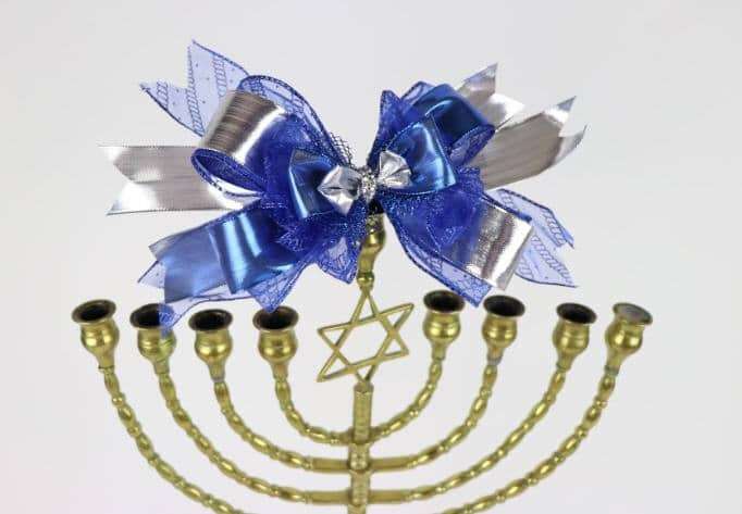 Sandy uses blue and silver ribbons (26” long and 2.5” wide), folding and scrunching them down in the Bowdabra, making loops. She then scrunches a few décor balls over it and tops it all with another ribbon (18” long and 2.5” wide). She ties it all to finish the beautiful Hanukkah bow that can also be used as a gift wrap décor.