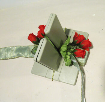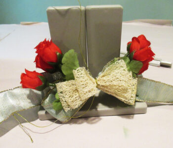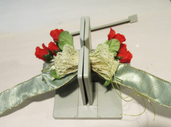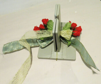 Selecting another ribbon, start creating another bow on top of the roses.